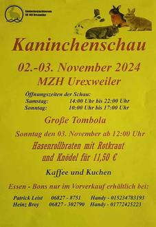 Am kommenden Wochenende findet die jährliche Kaninchenzuchtausstellung in unserer Mehrzweckhalle statt. Wie Ihr sicherlich wißt, ist unser örtlicher Kaninchenzuchtverein überregional erfolgreich und stellt regelmäßig Landes- und Bundessieger in den verschiedenen Rassen. Kommt also gerne vorbei und überzeugt Euch von der tollen Zuchtleistung. Besonders erfreulich zu erwähnen ist an dieser Stelle, dass auch in Urexweiler wieder viele Jungzüchter mit dabei sind und ihre Tiere ausstellen. Die Ausstellung findet am Samstag ab 14 Uhr sowie am Sonntag in der Zeit von 10 bis 17 Uhr statt. Für das leibliche Wohl ist gesorgt.