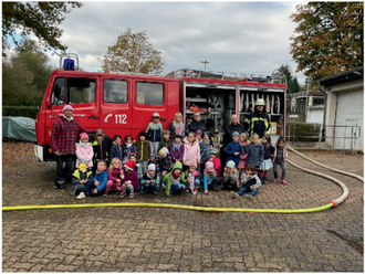 Vom 25.10. bis zum 27.10. war die Feuerwehr Marpingen bei uns zu Gast, um mit uns die Brandschutzbelehrung durchzuführen. Da nicht nur der Rettungsdienst, sondern auch die Feuerwehr unter der 112 zu erreichen ist, übten wir nochmals das Absetzen eines Notrufes und wie man sich bei Feuer verhalten soll. An Beispielen wurden die Kinder über den Unterschied zwischen gutem und schlechtem Feuer informiert. Zudem durften sie unter Anleitung mit Streichholz oder Feuerzeug eine Kerze anzünden und wieder gefahrenfrei löschen.