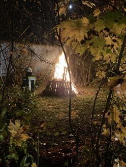 Anschließend ging es angeführt von der Jugendfeuerwehr und begleitet vom Posaunenchor Dirmingen über die Laubwiese und die Hümes zurück zum Dorfgemeinschaftshaus, wo auf alle Kinder wieder eine leckere Martinsbrezel sowie das Martinsfeuer warteten.