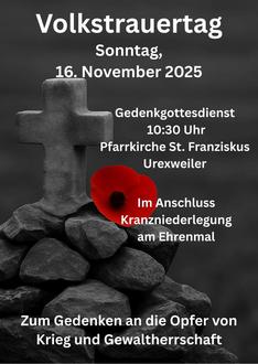 Am kommenden Sonntag, den 16. November, begehen wir den Volkstrauertag. In Urexweiler findet hierzu um 10:30 Uhr in der Pfarrkirche St. Franziskus ein Gedenkgottesdienst statt, der vom Ortsrat mitgestaltet wird. Anschließend legen wir gemeinsam einen Kranz am Ehrenmal nieder.