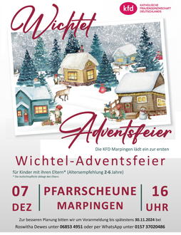 Am Samstag, dem 07. Dezember, ab 16 Uhr kann man diese in der Pfarrscheune erleben. Die kfd - Marpingen lädt Kinder im Alter zwischen 2 und 6 Jahren zu einer Wichtel-Adventsfeier ein.