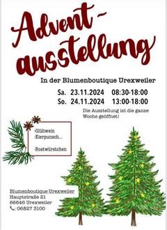 Ebenfalls an diesem Wochenende können Sie in der Blumenboutique Urexweiler in eine vorweihnachtliche Stimmung eintauchen. Die traditionelle Adventsausstellung von Ulli Lambert und ihrem Team bietet wieder wundervolle Dekorationen und kreative Ideen für die festliche Zeit. Ein Besuch lohnt sich – lassen Sie sich verzaubern und finden Sie vielleicht schon das ein oder andere Stück für Ihr Zuhause.