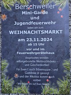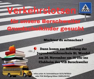 Gerne verweise ich auch noch auf die Infoveranstaltung für Verkehrslotsen, die am 26.11.24 um 16 Uhr im Clubheim des VFB stattfindet. Sicherlich eine sehr wichtige Initiative für die Berschweiler Kinder, die hoffentlich gut angenommen wird.