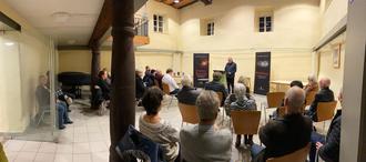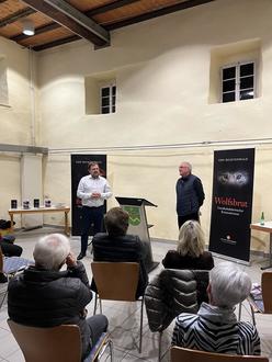 Bürgermeister Volker Weber erläuterte vor der Lesung den regionalen Zusammenhang zwischen Autor Udo Recktenwald, dem Lesungsort "Alte Mühle" und dem Verlag Edition Schaumberg. Er bedankte sich ebenfalls recht herzlich beim Landrat, dass er sich trotz vollen Terminkalenders die Zeit genommen habe, in seine alte Heimat nach Marpingen zu kommen, den Besucherinnen und Besuchern die spannende Lesung zu ermöglichen.