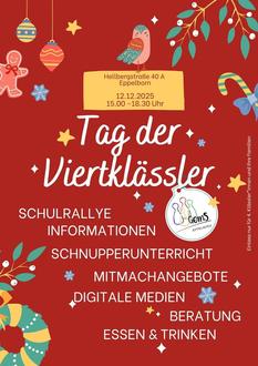 Am Freitag, 12.12.2025 haben die Viertklässler*innen, deren Geschwister und ihre Eltern, Großeltern... ab 15:00 Uhr bis 18:30 Uhr die Möglichkeit, in weihnachtlichem Ambiente die Besonderheiten der GemS Eppelborn kennenzulernen und zu erfahren. Die Wichtel-Holzwerkstatt, Chemielabor, Physikexperimente, Englischunterricht für kleine Wichtel, Schulrallye, Ganztagsklassen, Elterncafé und vieles mehr erwarten euch und Sie an diesem besonderen Tag. Um 16:00 Uhr informiert die Schulleitung über die Besonderheiten und das pädagogische Konzept der GemS Eppelborn.