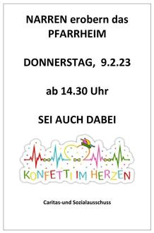 findet derm nächste Seniorennachmittag am Do, dem 9.2.23 im Pfarrheim in Marpingen statt. Es wird diesmal recht närrisch werden. Versprochen!! Lasst Euch überraschen.