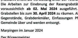 Die Arbeiten zur Einebnung der Rasengrabstätten durch den Gemeindebauhof werden voraussichtlich ab 02. Mai 2024 ausgeführt. Die Angehörigen werden gebeten, die Grabstellen bis zum 30. April 2024 zu räumen. Alle nach Ablauf dieser Frist nicht entfernten Gegenstände, Grabdenkmäler, Einfassungen Pflanzen usw. gehen in das Eigentum der Gemeinde über und werden entsorgt.