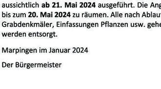 Die Arbeiten zur Einebnung der Grabstätten durch den Gemeindebauhof werden voraussichtlich ab 21. Mai 2024 ausgeführt. Die Angehörigen werden gebeten, die Grabstellen bis zum 20. Mai 2024 zu räumen. Alle nach Ablauf dieser Frist nicht entfernten Gegenstände, Grabdenkmäler, Einfassungen Pflanzen usw. gehen in das Eigentum der Gemeinde über und werden entsorgt.