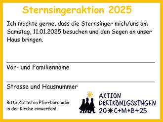 Auch in diesem Jahr bitten wir Sie, sich anzumelden, wenn Sie einen Besuch der Sternsinger wünschen!