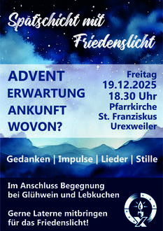 Ganz herzlich laden wir am Freitag, 19.12. um 18:30 Uhr zu unserer jährlichen Spätschicht in die adventlich ausgeleuchtete Kirche St. Franziskus ein.