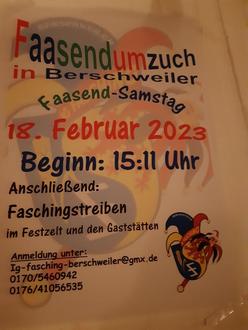 Am 18.2.23 startet der Fasendumzug, zu dem viele Fasendbooze aus nah und fern ins Dorf kommen, um beim Umzug und anschließend im Festzelt und in den örtlichen Gaststätten das närrische Fasendtreiben zu genießen.