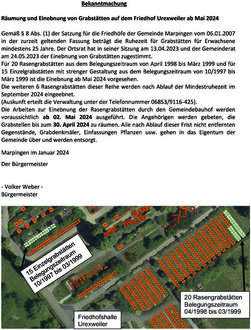 Gemäß § 8 Abs. (1) der Satzung für die Friedhöfe der Gemeinde Marpingen vom 06.01.2007 in der zurzeit geltenden Fassung beträgt die Ruhezeit für Grabstätten für Erwachsene mindestens 25 Jahre. Der Ortsrat hat in seiner Sitzung am 13.04.2023 und der Gemeinderat am 24.05.2023 der Einebnung von Grabstätten zugestimmt.