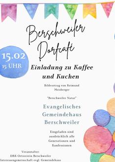Ein fester Termin, der sich in den letzten Monaten etabliert hat, ist das Berschweiler Dorfcafé, das immer am dritten Donnerstag im Monat in den Räumlichkeiten der Evangelischen Kirche stattfindet. Der nächste Termin ist folglich bereits am 15.2., neben Kaffee, Kuchen und gemütlichen Gesprächen gibt es diesmal auch einen sicherlich sehr interessanten Bildvortrag von Reimund Meisberger, der uns die Natur um Berschweiler näherbringt.