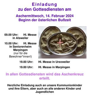 | ALSW | 09:00 | Hl. Messe mit Austeilung des Aschenkreuzes |