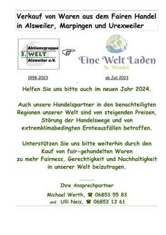 wurde dieser Tage beschlossen. Er liegt in der Zeit vom 05. bis 18.02.2024 zu den Öffnungszeiten im Pfarrbüro Marpingen aus.