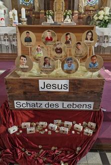 "Jesus, Schatz des Lebens" so lautet das diesjährige Thema der Erstkommunion in unserer Pfarrei. Am vergangenen Sonntag haben sich unsere 11 Kommunionkinder der Gottesdienstgemeinde vorgestellt.