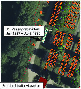 Für 11 Rasengrabstätten aus dem Belegungszeitraum von Juli 1997 bis April 1998 ist die Einebnung ab Mai 2023 vorgesehen.