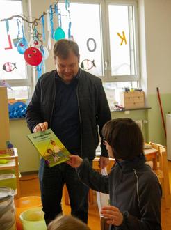 Die Lesung fand mit den Kindern der Vorschulgruppe „Schlaufuchs“ statt. Die rund 30 Kids, im Alter von 5 bis 6 Jahren hörten Bürgermeister Volker Weber in den 30 Minuten gespannt zu. Mit dabei waren auch die ErzieherInnen Conny, Jasmin und Thorsten sowie die PraktikantInnen Lianet, Lars und Justin. Nach der gelungenen Buchlesung tauschte sich Volker Weber mit den Kindern zum Thema „Spielplatz“ aus. Die Kinder erzählten dem Bürgermeister zum Beispiel, was auf einem Spielplatz nicht fehlen darf: Schaukeln, Rutschen, ein Kletterturm oder Sandkasten etc. Manche wollten auch eine Rakete oder einen Süßigkeitenstand, was natürlich nicht so einfach zu realisieren ist, aber für viele schöne Gespräche zwischen Bürgermeister und den Kindern führte.