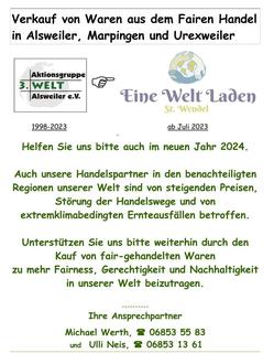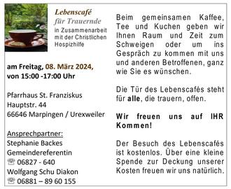 Für Urexweiler: Markus Barrois, Tel. 0151 1833 4680 Peter Keßler, Tel. 0171 740 7950, Pfarrbüro: 06827 640