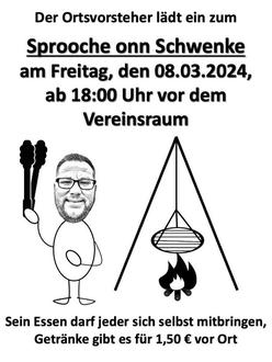 Das bekannte Format „Sprooche onn Schwenke“, zu dem immer zahlreiche Exweller kommen, startet in die diesjährige Saison. So freue ich mich, Euch für den 8. März 2024 vor den Vereinsraum einzuladen.