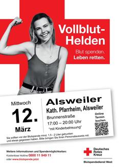 Die nächste Blutspende im Pfarrheim in Alsweiler findet am nächsten Mittwoch, dem 12.03.2015, wie gewohnt von 17:00 Uhr bis 20:00 Uhr statt.