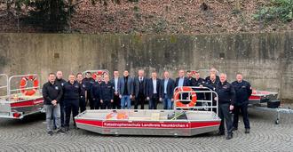 Bildunterschrift: Die Hoffnung bleibt, dass sie möglichst selten zum Einsatz kommen: Landrat Sören Meng übergibt die vier beschafften Flachwasserboote an die Feuerwehren Neunkirchen, Ottweiler, Eppelborn und Merchweiler.