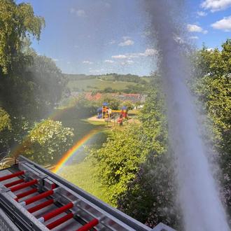 Zum Abschluss durften die Kinder selbst zur Tat schreiten und mit Schlauch und Strahlrohr "löschen".
