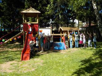 Ende April war es endlich so weit. Das lang ersehnte neue Außenspielgerät konnte feierlich eröffnet werden. Nachdem das alte Klettergerüst und die Rutschbahn aus Sicherheitsgründen entfernt wurden, musste etwas Neues her.
