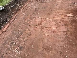 Nach dem Asphaltausbau wurden an verschiedenen Stellen auf der Planumsebene historische Pflasterflächen mit zugehörigen Randeinfassungen sichtbar.