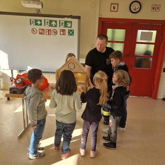 Anschließend haben wir das Thema "Rauch" behandelt. An einem Rauchdemohaus konnten die Kinder sehen und testen, wie man sich am besten bei einem Brand verhält. Auch die wichtige Rolle von Rauchmeldern wurde deutlich. Wer wollte, durfte auch noch eine Fluchthaube anprobieren.