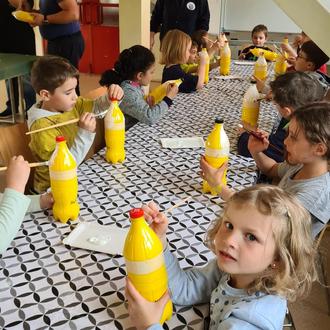 Dann bastelten die Bambini ihre eigenen Atemschutzgeräte. Dazu wurden Plastikflaschen von innen und außen mit Farbe gestaltet. Außerdem wurden Buttons mit dem Bild eines Druckmanometers gepresst. Die Betreuerinnen und Betreuer erledigten die Arbeiten, die zu gefährlich oder zu aufwendig für die Kinder waren und stellten die Atemschutzgeräte fertig.