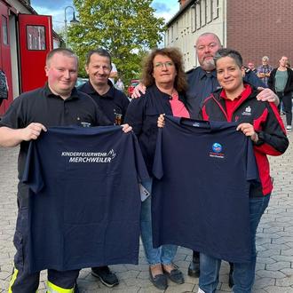 Für die Beschaffung der T-Shirts haben Petra Riedel, Ortsvorsteherin von Merchweiler, und Bürgermeister Patrick Weydmann über die Sparkasse insgesamt 1000 € bereitgestellt. Dadurch konnte jedem Mitglied der Kinderfeuerwehr ein kostenloses T-Shirt überreicht werden.