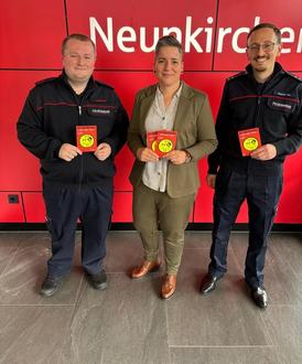 Mit Unterstützung der Sparkasse hat die Feuerwehr Merchweiler rund 750 Kinderfinder-Aufkleber im eigenen Design angeschafft. Diese werden im Rahmen der Brandschutzerziehung an alle Kinder in den Grundschulen und Kindertagesstätten der Gemeinde Merchweiler verteilt.