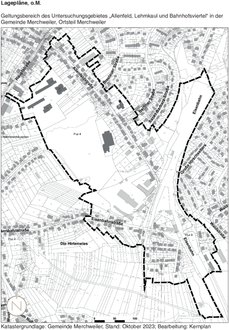 Der räumliche Geltungsbereich des Untersuchungsgebietes umfasst alle Grundstücke und Grundstücksteile innerhalb der im beigefügten Lageplan (Plangrundlage: Gemeinde Merchweiler, LVGL Saarland; Stand: Oktober 2023) durch eine Umgrenzungslinie abgegrenzten Fläche. Die Größe des Gebietes „Allenfeld, Lehmkaul und Bahnhofsviertel“ beträgt ca. 34 ha. Das Untersuchungsgebiet erstreckt sich dabei vom Gelände der Allenfeldschule im Nordwesten bis zum Bahnhofsquartier im Südosten. Es wird nordöstlich begrenzt von der Allenfeldstraße und im Süden von der Eisenbahnstraße und dem Wohnviertel am Käsborn. Innerhalb des Gebietes liegen dabei auch die Sport- und Freizeitanlage „Lehmkaul“ mit dem gleichnamigen Weiher sowie die Flächen der ehem. Tennisanlage im Süden des Gebietes.
