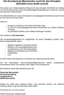 Wir suchen zum nächstmöglichen Zeitpunkt für das Schuljahr 2023/2024 im Umfang von 39 Wochenstunden einen Bundesfreiwilligendienstleistenden (m/w/d) für unsere Grundschule in Merchweiler!