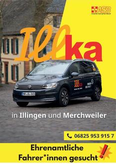 unser Rufbus „ILLka“ ist ein Angebot der Gemeinden Merchweiler und Illingen, in Kooperation mit dem ASB Ortsverein Illingen, welches vor allem zahlreichen Senioren den Alltag erleichtert. Um dieses Angebot auch dauerhaft aufrecht erhalten zu können, benötigen wir weitere ehrenamtliche Fahrerinnen und Fahrer. Sollten Sie Interesse hieran haben, können Sie sich gerne jederzeit beim ASB Ortsverein Illingen (Tel. 06825/953 915 7) melden, um weitere Informationen zu erhalten.“