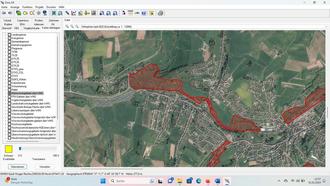 Beispiel Eppelborn: Die Ill-Aue ortseingangs hält Wassermengen zurück, durch die ansonsten das (vor langer Zeit) in die Aue gebaute Gewerbegebiet bei jedem Hochwasser überschwemmt würde (Luftbild oben, das Naturschutzgebiet ist rot schraffiert). Hinter dem Gewerbegebiet bis zur Mündung in die Theel stehen dann wiederum große Überschwemmungsflächen zur Verfügung, die nur als extensive Mähwiesen genutzt werden (Luftbild unten, das Naturschutzgebiet ist rot schraffiert).