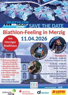 Die Kreisstadt Merzig veranstaltet am Samstag, 11. April 2026, 09:30-17:30 Uhr,in der Fußgängerzone vor dem Stadthaus wieder die beliebte Biathlon-Tour. Das Event besticht mit bester Stimmung, reichlich Action, wahrem Biathlonfeeling – und in diesem Jahr zusätzlich mit einem Sporthighlight der absoluten Spitzenklasse.