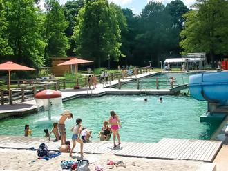 Holzstege über den Wasserflächen, ein Bachlauf mit Spiellandschaft für Kleinkinder, ein Sprungturm, eine Wasserrutsche, ein Beachvolleyballfeld und reichlich Liegefläche hat das im Herzen der Merziger Innenstadt gelegene Naturbad allen Freiluft-Fans zu bieten. Im Unterschied zu herkömmlichen Freibädern wird das Wasser nicht chemisch, sondern biologisch gereinigt.
