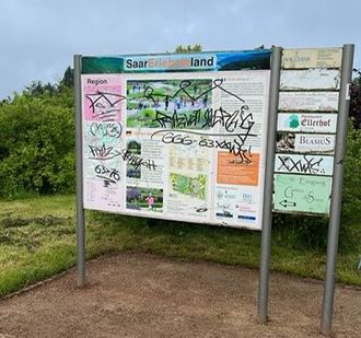 Bereits Anfang April kam es im Merziger Stadtgebiet vermehrt zu Vandalismusschäden. Was anfänglich mit einem ummontierten Wanderwegschild begann und zu diesem Zeitpunkt durch die Kreisstadt Merzig als Aprilscherz eingestuft wurde, mündet inzwischen in Sachbeschädigung. Neben diversen Beschilderungssystemen und Infotafeln wurden in den vergangenen Wochen ebenso das digitale Informationsterminal in der Fußgängerzone (Schankstraße) sowie Bänke und Möblierungen mit Graffiti besprüht und beschädigt.