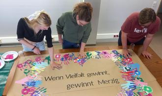 Mit gleich zwei Präsenzveranstaltungen beteiligte sich die Kreisstadt Merzig in diesem Jahr am deutschen „Diversity Tag“, der am 27. Mai stattfand: so waren die Mitarbeiterinnen und Mitarbeiter im Vorfeld eingeladen, farbige Handabdrücke anzufertigen. Daraus wurde ein Herz geformt, in dessen Mitte das diesjährige Motto „Wenn Vielfalt gewinnt, gewinnt Merzig“ prangte.