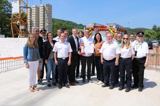 Da die Arbeiten am zukünftigen Standort des Löschbezirks Brotdorf bereits begonnen haben, wurde an diesem Tag neben dem Zuwendungsbescheid auch die Fertigstellung der Bodenplatte sowie die Grundsteinlegung im Beisein zahlreicher Feuerwehrkameradinnen und -kameraden sowie Ortsvorsteher Torsten Rehlinger und der Landtagsabgeordneten Martina Holzner gefeiert.