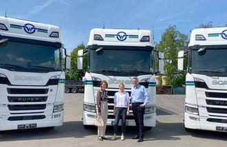 „Unsere Flotte ist spezialisiert auf Lebensmitteltransporte und das Handling anderer sensibler Rohstoffe. Auch für Gefahrgüter und genehmigungspflichtige Transporte besitzen wir die notwendige Fahrzeugtechnik und Qualifizierung. Unsere Visitenkarte sind daher unsere kompetenten und engagierten Fahrer“, erklärt Diana Wagner. Die fristgerechte Abwicklung der Aufträge ist besonders wichtig und steht im Zentrum des Zusammenspiels zwischen Disponenten und Fahrern. Ca. 60 Fahrer sind am Standort Hilbringen beschäftigt und ebenso viele am Standort in Luxemburg. In regelmäßigen Schulungen trainieren die Fahrer die Beherrschung von Fahrzeugen und kritischer Fracht. Zudem gehört die Wagner-Gruppe zu den wenigen Fachspeditionen, die neben den Alltagsgeschäften auch Großprojekte ohne Probleme abwickeln kann. Die Geschäftsführerin legt größten Wert auf ein gutes Betriebsklima, denn nur so kann ein Familienunternehmen erfolgreich am Markt bestehen. Daher ist die Einhaltung von tariflichen und gesetzlichen Rahmenbedingungen selbstverständlich. Der Fuhrpark ist immer auf dem neusten Stand der Technik bei Zugmaschinen und Aufleger. Hoffeld ließ es sich daher nicht nehmen, selbst in einem LKW Platz zu nehmen und zeigte sich beeindruckt von der modernen Ausstattung.