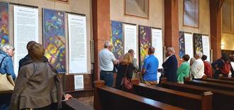 Natürlich konnten sich die Anwesenden ebenfalls den Merziger Bilderzyklus unter der Überschrift „Sendschreiben der Apokalypse" in der Kirche St. Peter ansehen. Die sieben Sendschreiben aus dem Zyklus zur Offenbarung des Johannes werden hier künstlerisch dargestellt und mit Schreiben prominenter Persönlichkeiten in Beziehung gebracht, die wie die biblischen Sendschreiben sowohl ermutigende als auch ermahnende Worte beinhalten.