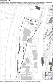 Das Plangebiet liegt innerhalb des Stadtgebietes Merzig und umfasst einen überwiegend bereits bebauten bzw. versiegelten und demnach anthropogen vorgeprägten Bereich. Begrenzt wird der Geltungsbereich durch die Verkehrsflächen der Lothringer Straße (L 173) im Norden, der L 174 im Westen und Rieffstraße im Osten.
