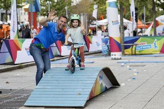 Fahrraderlebniswelt der „kinder Joy of Moving mini tour“ (12:00 - 17:00 Uhr): Kleine und größere Biker können in der Erlebniswelt ihre Fähigkeiten im Radfahren austesten und unter professioneller Anleitung verbessern. Egal ob Slalomfahren oder über eine Rampe balancieren – der Lernparcours sorgt für jede Menge Spaß und tolle Möglichkeiten das Radfahren mal von einer ganz anderen Seite zu erleben - einfach vorbeikommen und ausprobieren.