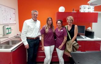 Vergangene Woche besuchte Oberbürgermeister Marcus Hoffeld zusammen mit Nadja Pastorcic von der Wirtschaftsförderung der Kreisstadt Merzig die Tierarztpraxis am Gipsberg. Hoffeld überreichte Dr. Yvonne Schomburg eine kleine Aufmerksamkeit und ließ sich interessiert alle Räumlichkeiten zeigen. Besonders beeindruckt war der Oberbürgermeister von der modernen Ausstattung. „Das hauseigenes Labor, digitales und dentales Röntgen, standardisierte Prozesse bis hin zur digitalen Krankenakte ermöglichen ein zügiges und vernetztes Arbeiten“, so Schomburg.