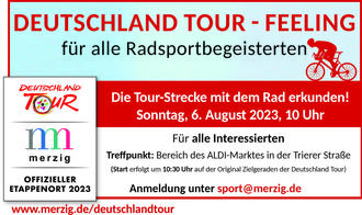 Bereits jetzt am Sonntag, 6. August, können Radsportbegeisterte „Deutschland Tour-Feeling“ mit der kostenlosen „Vorab-Ausfahrt“ erleben und somit einen Teil der Original-Strecke mit dem eigenen Zweirad erkunden. Anmeldung zur Vorab-Ausfahrt unter der E-Mail-Adresse: sport@merzig.de