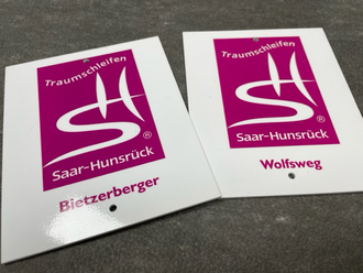 Ob als Mitbringsel aus dem Urlaub, als Erinnerungsstück oder gar Dokumentation für die bereits begangenen Wander-Wege können sie ab sofort die Wanderwegs-Erinnerungsschilder der Merziger Premiumwanderwege „Wolfsweg“ und „Bietzerberg“ in der Tourist-Info der Kreisstadt Merzig käuflich erwerben.