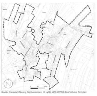(1) Der räumliche Geltungsbereich des Sanierungsgebietes umfasst alle Grundstücke und Grundstücksteile innerhalb der im anliegenden Lageplan (Quelle: Kreisstadt Merzig; Geobasisdaten, @ LVGL MZG 007/04) durch eine Umgrenzungslinie abgegrenzten Fläche. Der Lageplan ist Bestandteil der Satzung und wird zu jedermanns Einsicht bei der Kreisstadt Merzig, Rathaus, während den allgemeinen Dienststunden bereitgehalten.